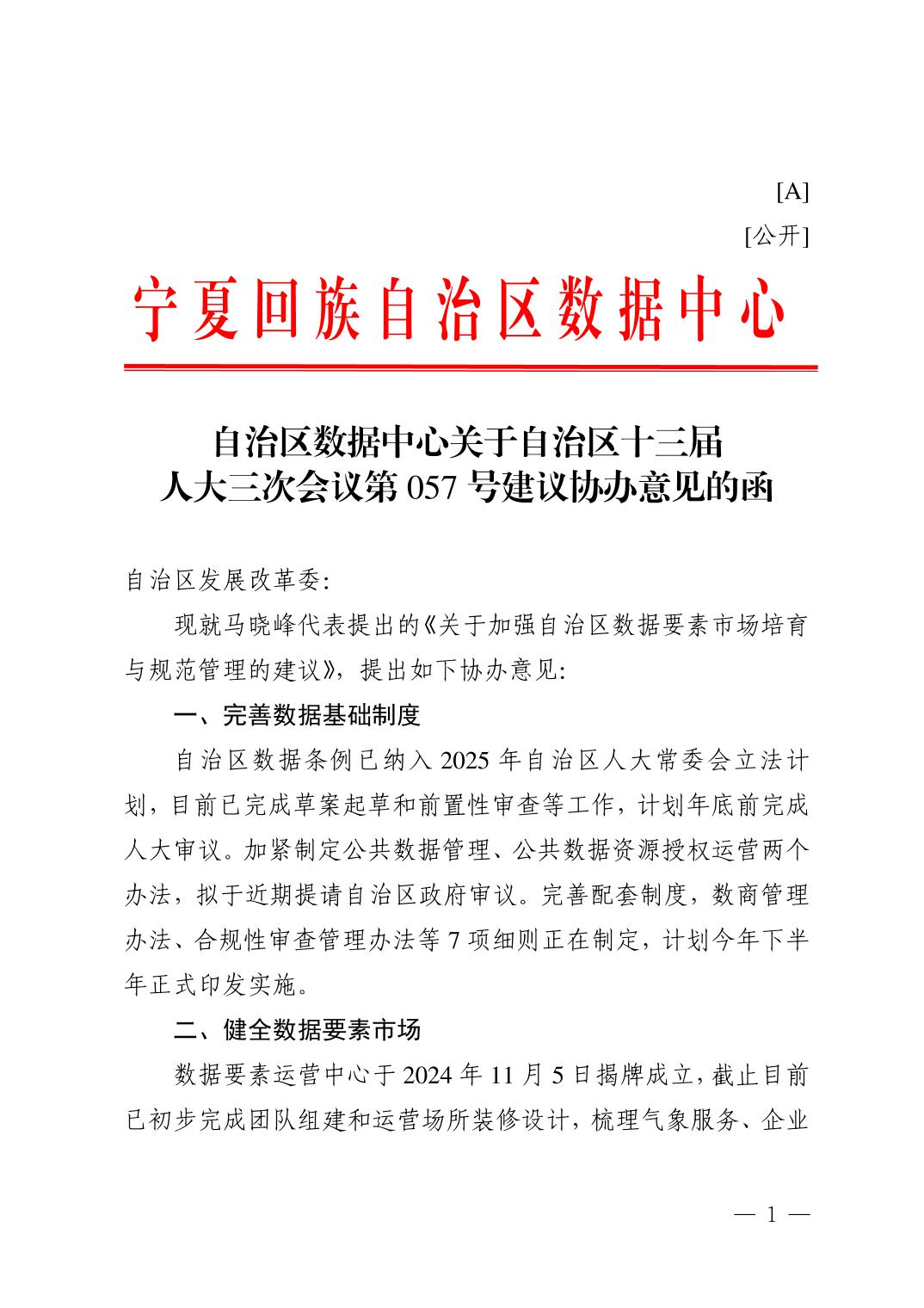 自治区数据中心关于自治区十三届人大三次会议第057号建议协办意见的函